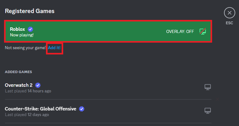 Nella categoria "Giochi registrati", Roblox dovrebbe essere visibilmente attivo. Se la sua presenza ti sfugge, non preoccuparti. Basta fare clic su "Aggiungi!" e digitare "Roblox" nella casella di ricerca per registrare manualmente il gioco. Una volta aggiunto, Roblox prende il posto che gli spetta nell'elenco dei giochi registrati.