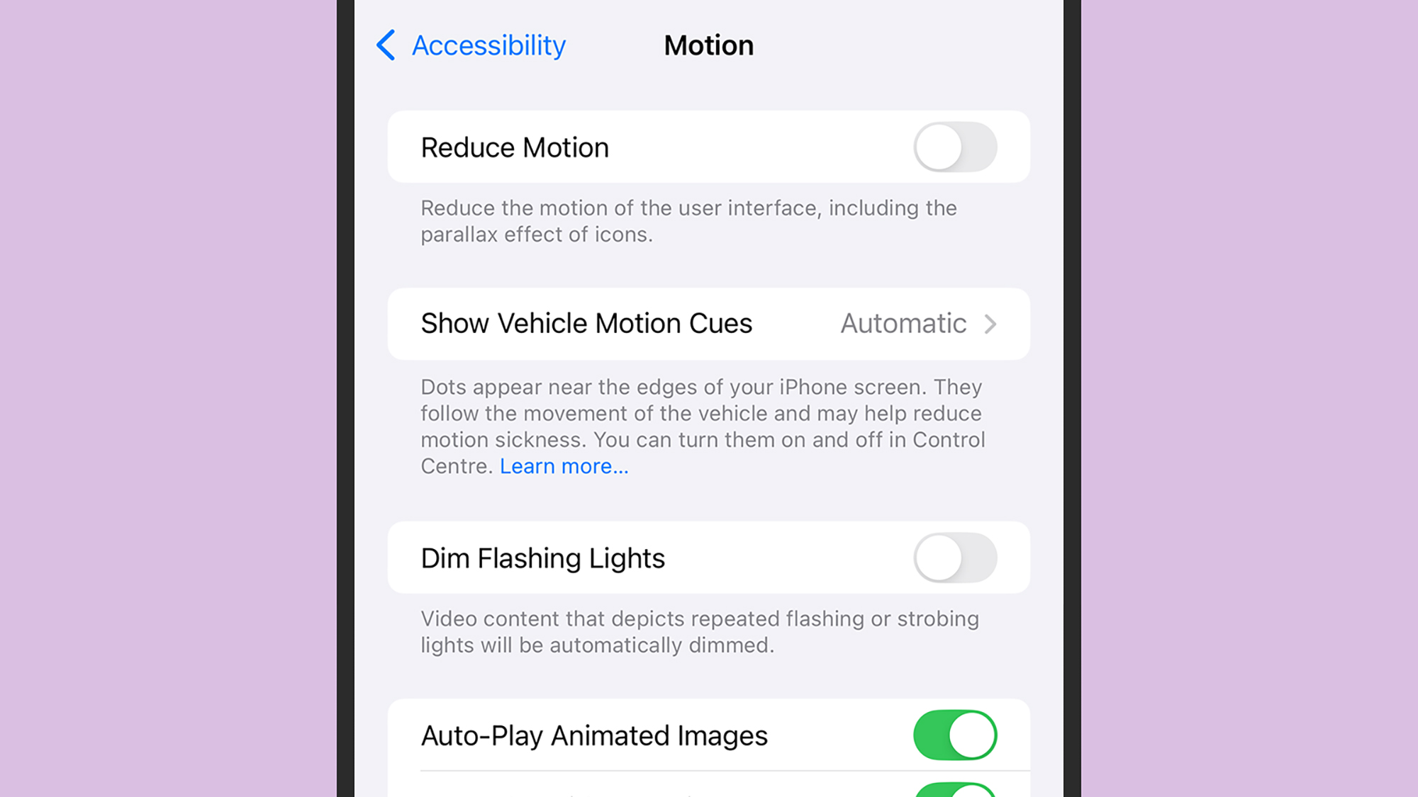"La ricerca mostra che la cinetosi è comunemente causata da un conflitto sensoriale tra ciò che una persona vede e ciò che sente, che può impedire ad alcuni utenti di utilizzare comodamente un iPhone o iPad mentre viaggiano in un veicolo in movimento,"dice Apple. "Con Vehicle Motion Cues, i punti animati sui bordi dello schermo rappresentano i cambiamenti nel movimento del veicolo per aiutare a ridurre i conflitti sensoriali senza interferire con il contenuto principale."