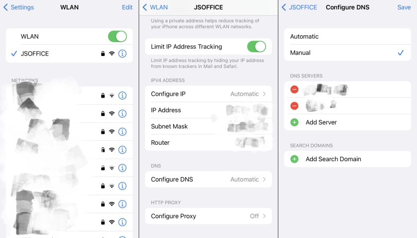 Passaggio 3.ScegliereConfigura DNSe colpireManuale > Aggiungi server. Inserisci il valore DNS in base alla tua posizione proprio in questo modo.