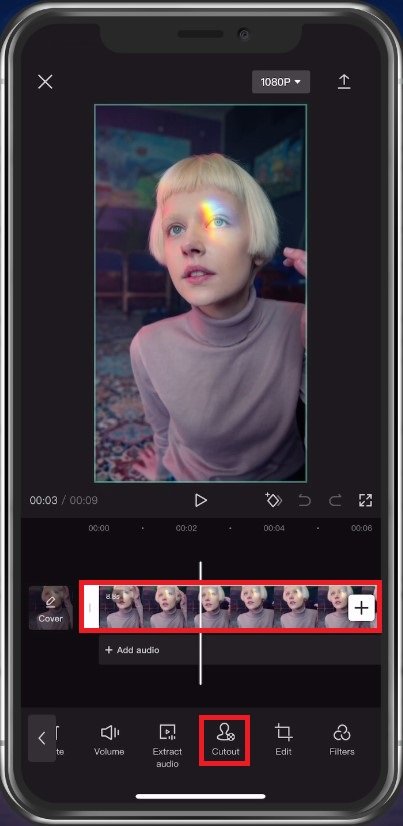 Dopo aver importato il video, assicurati di selezionarlo nella timeline. Questo ti mostrerà varie opzioni ed effetti nella barra degli strumenti nella parte inferiore dello schermo. ToccaRitagliare.