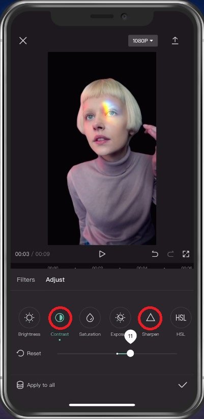 SottoFiltri, scegli un filtro che funzioni meglio con il tuo video. Puoi utilizzare filtri preimpostati o quando tocchiRegolare, è possibile regolare manualmente ilLuminosità,Contrasto,Saturazione,e così via. In molti casi, vorrai aumentare ilAffilareEContrastoopzioni per migliorare leggermente l'aspetto del video. Dopo aver apportato le modifiche, puoi procedere alla riproduzione del video prima di apportare eventuali modifiche finali.