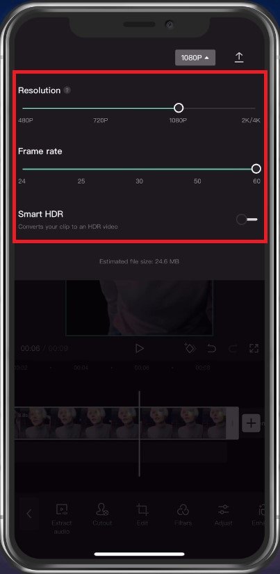 Prima di esportare il video, tocca il pulsante accanto alla freccia di esportazione nella parte superiore dello schermo. Ecco, aumenta ilRisoluzioneEFrequenza fotogrammiper garantire che la risoluzione video corrisponda al video originale. Dopo aver esportato il video, puoi visualizzare in anteprima la dimensione stimata del file nella parte inferiore di questa finestra.