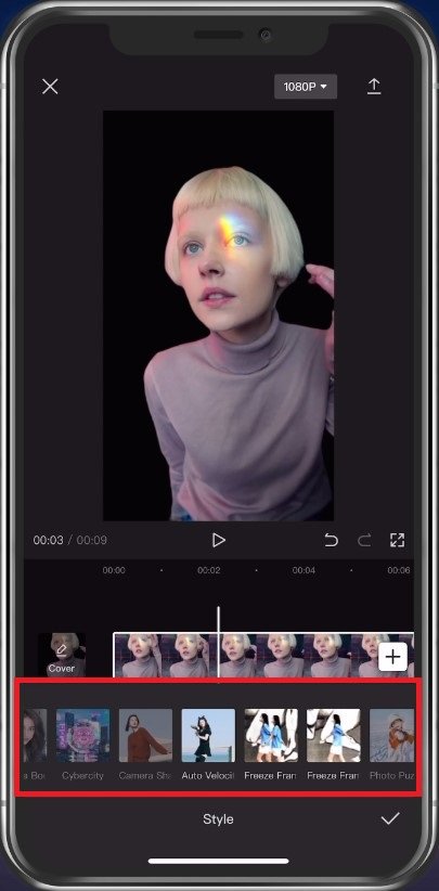Al termine, puoi cambiare lo sfondo del tuo nuovo video e i suoi effetti. Durante la selezioneStile, hai la possibilità di scegliere tra effetti professionali. Potrebbero essere necessari alcuni secondi per applicarli al tuo nuovo video.