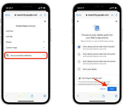 - Puoi scegliere di conservare i dati di ricerca per3,18, O36 mesifino a quando non verrà eliminato automaticamente. Selezionare l'opzione desiderata, quindi toccareProssimo.