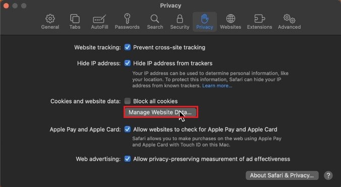 Impostazioni Safari > Privacy > Gestisci dati sito web