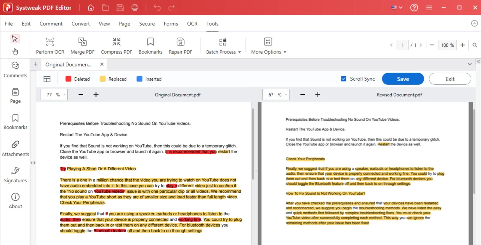 Systweak PDF Editor evidenzierà il contenuto che è stato cancellato, sostituito o appena inserito tra i due documenti.