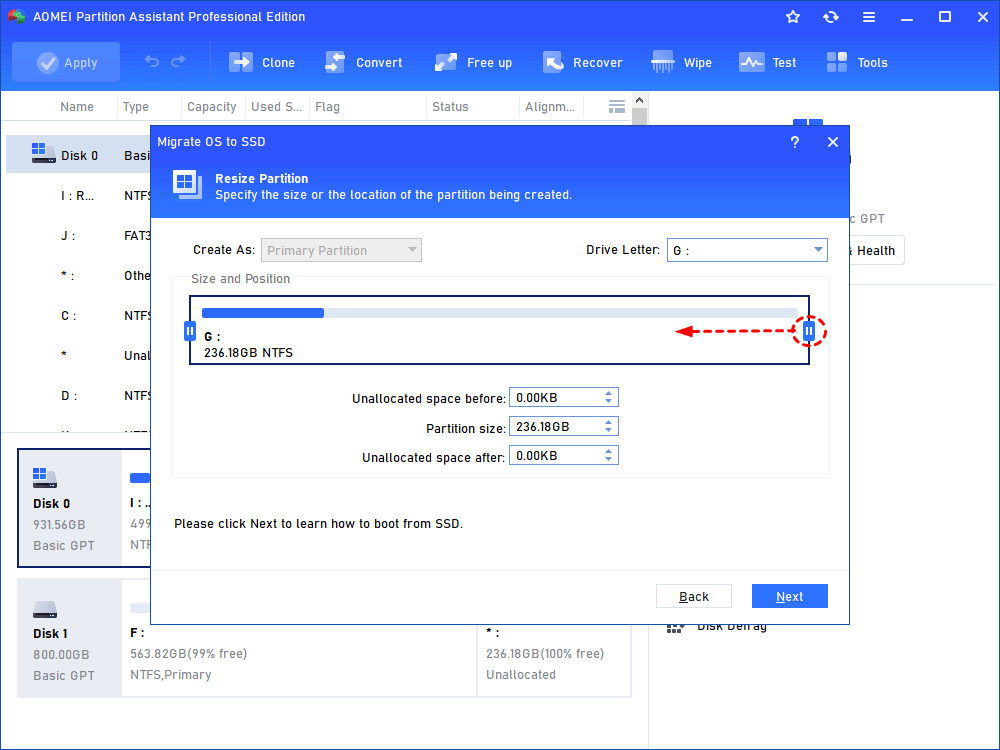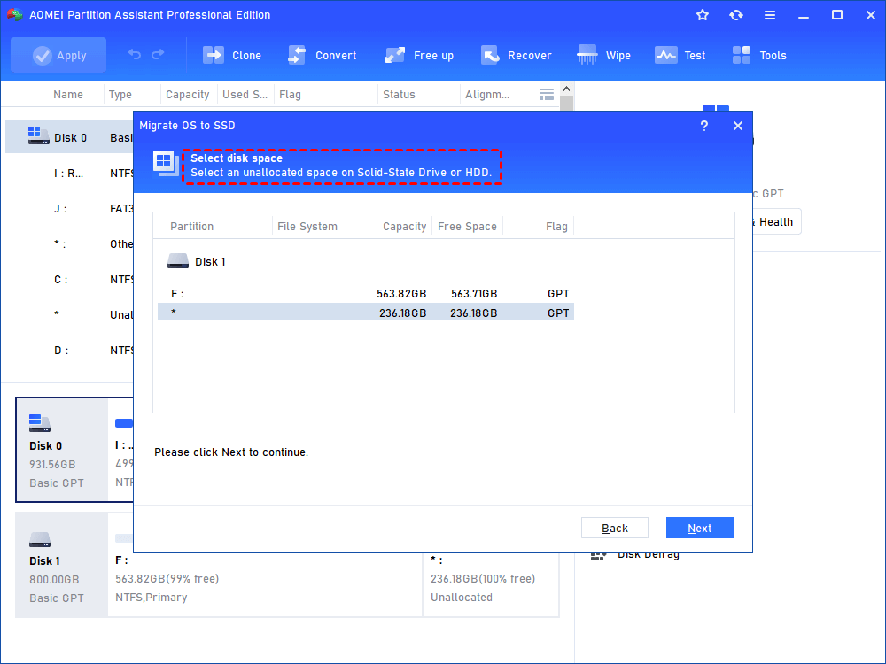 Passaggio 2. Seleziona una partizione o uno spazio non allocato sul disco di destinazione (ad esempio, un SSD GPT collegato al computer). Fare clic su "Avanti".