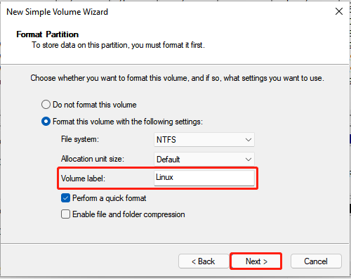 Passaggio 6. Assegna una lettera di unità alla nuova partizione ed etichettala "Linux". Infine, fai clic su “Fine” per terminare il processo.