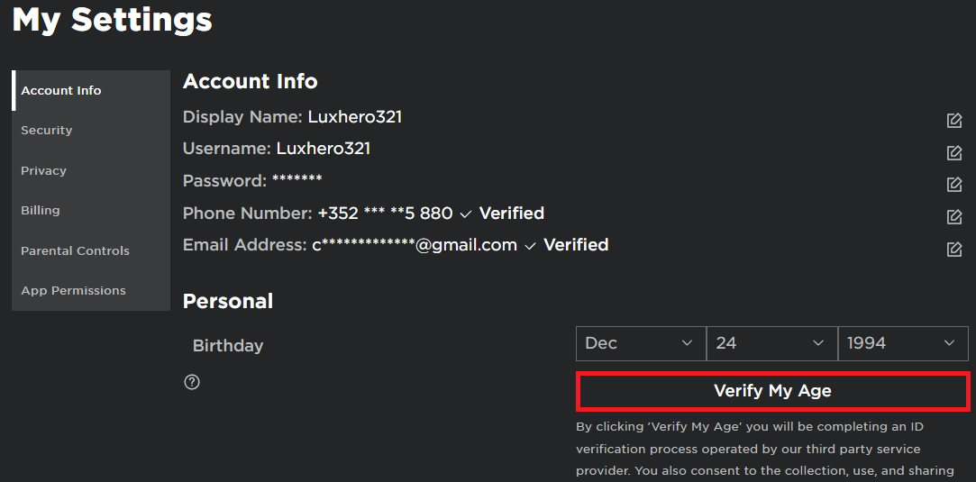 Impostazioni delle informazioni sull'account Roblox > Verifica la mia età