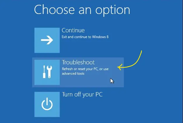 - Quindi fai clic su "Risoluzione dei problemi" dalla schermata "Scegli un'opzione".