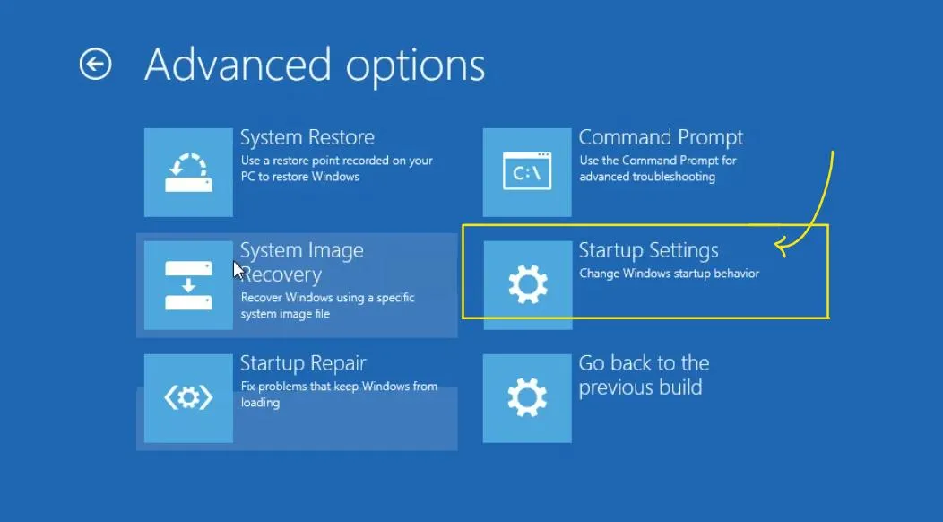 - Qui vedrai alcune opzioni avanzate, fai clic su "Impostazioni di avvio" per visualizzare le opzioni di "Riavvio".