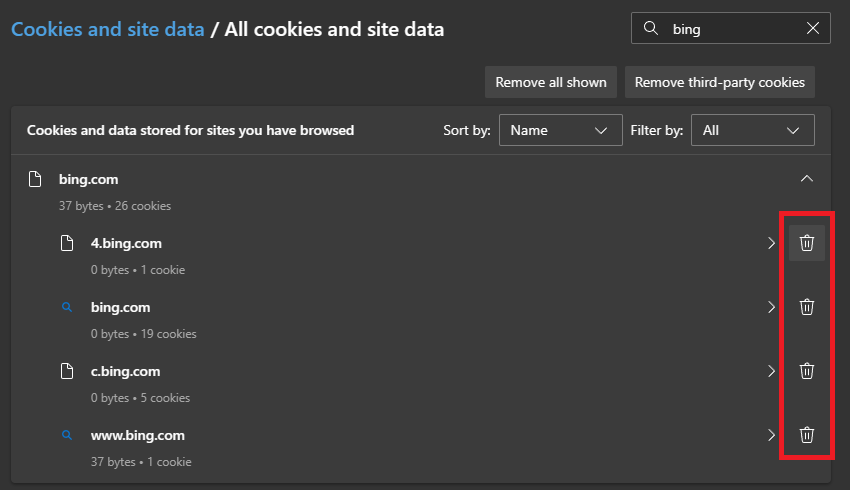 Elimina i dati del sito e i cookie per il dominio Bing.com