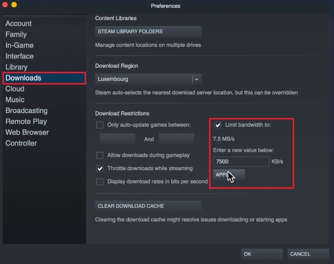 Di seguito puoi limitare la larghezza di banda di download, cosa che mi piace fare quando utilizzo il mio Mac, ma questo, a sua volta, ridurrà anche la velocità di download per Steam. Suggerirei di limitare la velocità di download, poiché altre app o download sul tuo Mac potrebbero riscontrare problemi quando Steam utilizza tutte le tue risorse.