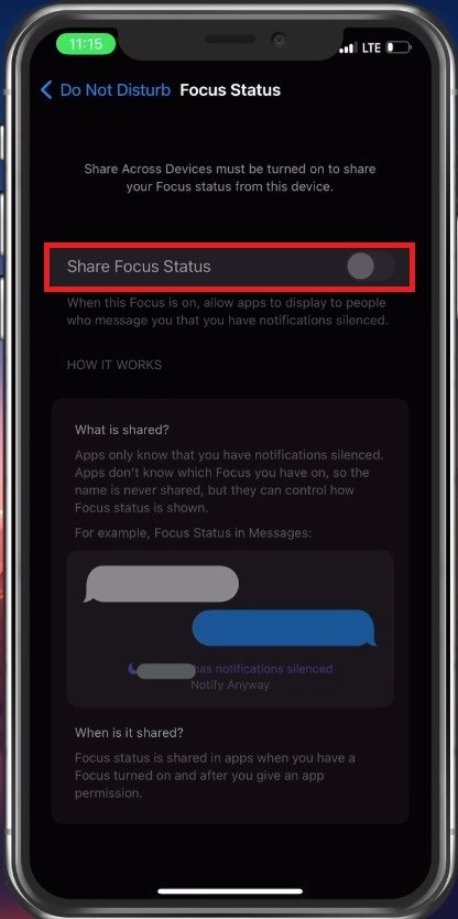 Nelle impostazioni Focus, disabilita ilCondividi su tutti i dispositiviopzione. Ciò impedirà ad altri dispositivi iOS di utilizzare o attivare le impostazioni di messa a fuoco.