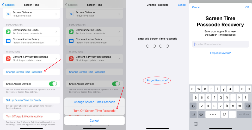 Passaggio 2.SelezionareDisattiva il passcode del tempo sullo schermo, quindi toccaHai dimenticato il codice?.