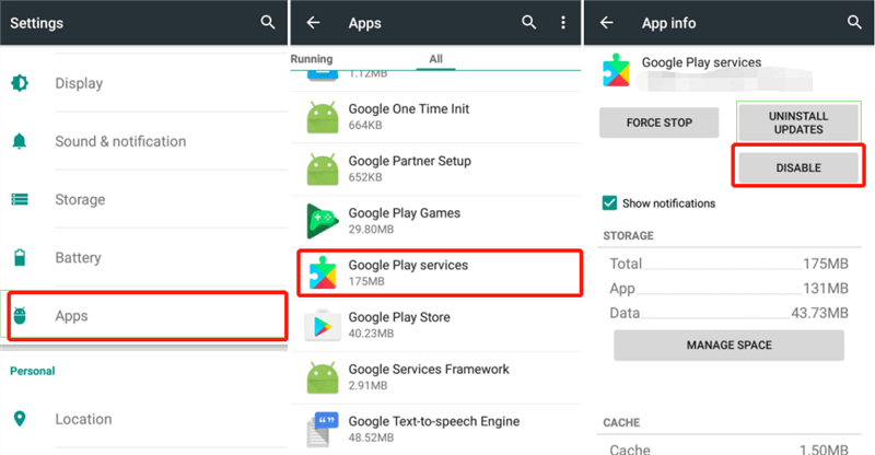 - In Google Play Services tocca Menu > Scegli Disattiva > Tocca OK.