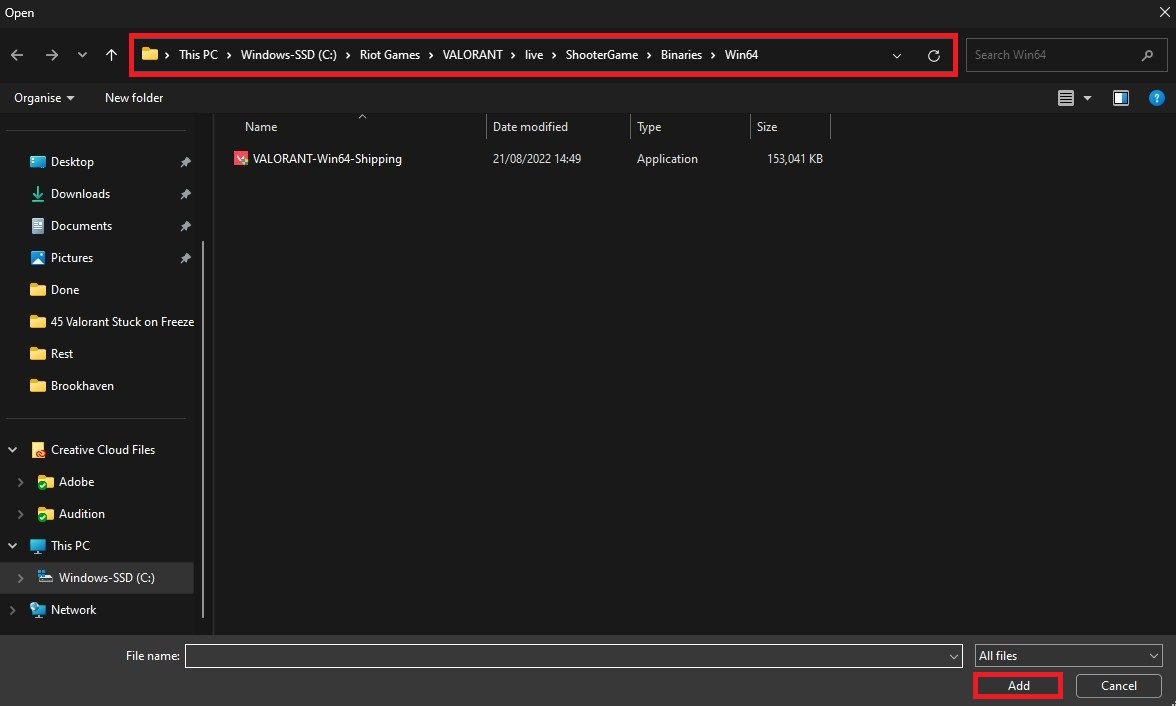 Da qui, vai all'unità su cui installiGiochi di rivolta. Nel mio caso, questo sarà il valore predefinito C: drive > Riot Games > VALORANT > live > ShooterGame > Binaries > Win64. Seleziona ilValorant-Win64-Spedizioneapplicazione e fare clic suAggiungere.