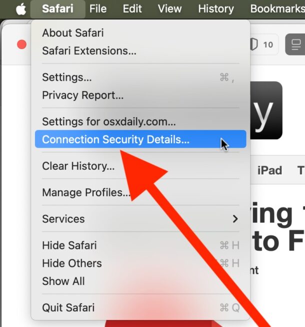 - Apri il menu “Safari” e scegli “Dettagli sicurezza connessione…”