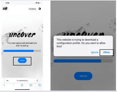 Passaggio 2:Visita il sito webunc0verjb.cce fare clic suPulsante "Jailbreak".. Quindi, nel popup, fai clic su "Consenti". Quindi vai su Impostazioni e fai clic"Profilo scaricato."Quindi fare clic"installare"per installarlo.