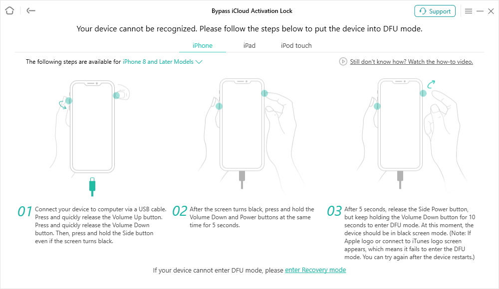 Quindi, seleziona il modello del tuo dispositivo e segui le istruzioni sullo schermo. Il tuo dispositivo entrerà in modalità DFU.