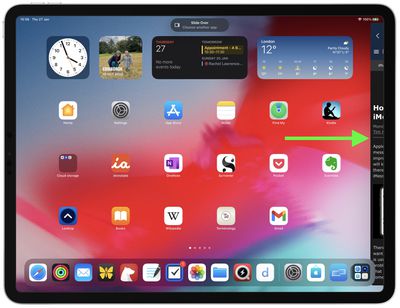 - Tocca e tieni premuta un'altra app nel Dock, quindi trascinala fuori dal Dock e rilascia l'app al centro dello schermo. La seconda app apparirà in una finestra Slide Over.