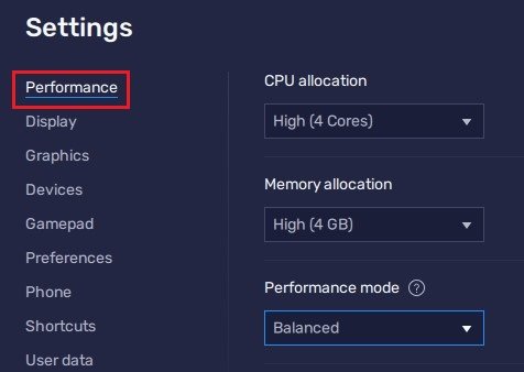 Durante il download del gioco, dovresti controllare le impostazioni dell'emulatore. Fai clic sull'icona a forma di ingranaggio per accedere a queste impostazioni. NelPrestazionescheda, dovresti impostarli in base alle prestazioni del tuo PC. Assegnare aAltoquantità diCore della CPUse non hai molte altre applicazioni in esecuzione in background. Lo stesso vale per il tuoMemoriaallocazione. Per gli utenti con4GBo meno RAM, impostare questa opzione suBasso.