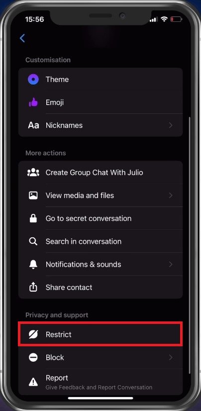 In alternativa, puoi anche scorrere l'intera chat verso sinistra, toccare ilDi piùicona e selezionareLimitare.