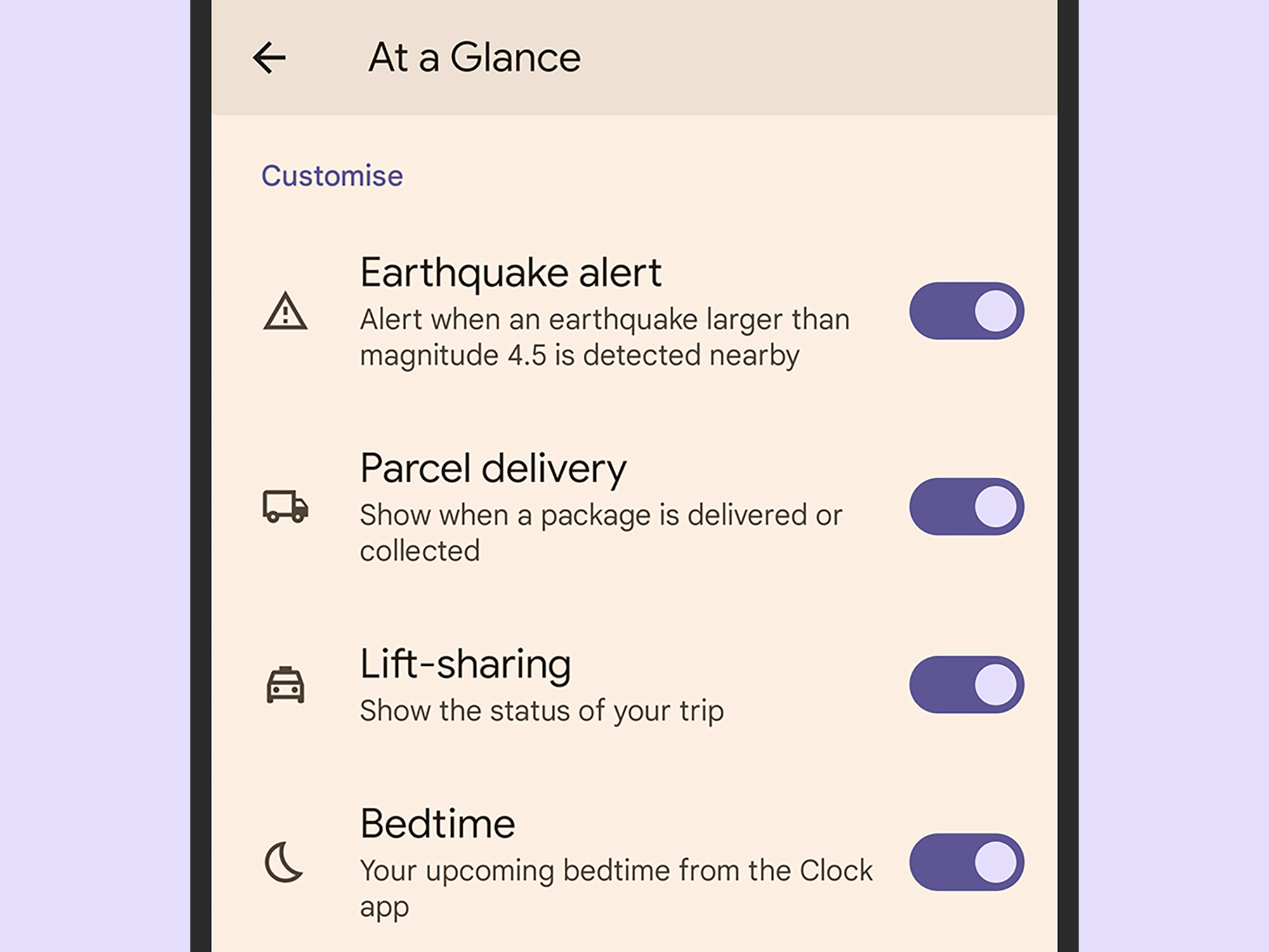 Per modificare ciò che mostra questo widget, toccalo e tienilo premuto nella schermata principale, quindi scegliPersonalizzae toccaicona dell'ingranaggioaccanto aA colpo d'occhio. Vedrai un lungo elenco di interruttori per il controllo del contenuto nel widget (e altro ancora dietroVisualizza più funzionalità), compresoFitness,Ora di andare a dormire,Consegna pacchi, ETragitto casa-lavoro.