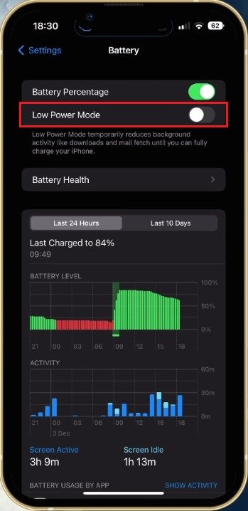 Dopo aver dato un'occhiata alla memoria del tuo iPhone, torna alle impostazioni principali e selezionaBatteria. Qui, disabilita ilModalità di risparmio energetico. Ciò può rallentare il tuo iPhone quando abilitato, ma anche la durata della batteria sarà ridotta.
