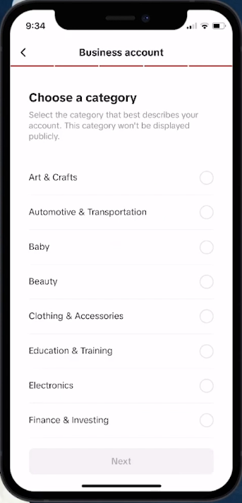 Quando passi a un account aziendale, TikTok ti guida attraverso alcuni passaggi di configurazione.