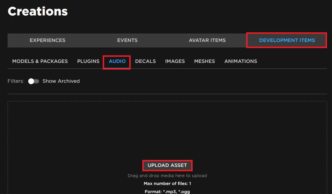 Creazioni Roblox > Elementi di sviluppo > Audio > Carica risorsa