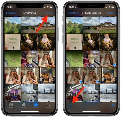 - Tocca diverse Live Photos in modo che venga visualizzato un segno di spunta blu nell'angolo di ciascuna miniatura.