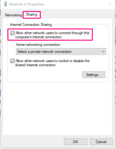 - Fare clic su "Condivisione" scheda in alto eselezionare la casellache dice: "Consenti ad altri utenti della rete di connettersi tramite la connessione Internet di questo computer.”