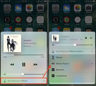 Il pulsante si trova nella parte inferiore della sezione Apple Music e dovrebbe essere impostato su "iPhone", quindi toccalo per visualizzare un elenco di potenziali dispositivi a cui puoi connetterti per espandere le capacità di ascolto della traccia corrente a un gruppo più ampio. Questi dispositivi potrebbero includere qualsiasi altoparlante Bluetooth nel raggio d'azione che hai già configurato tramite Impostazioni o una Apple TV di terza o quarta generazione. Scegli l'uscita su cui preferisci trasferire la riproduzione e puoi ripristinare l'iPhone come predefinito tornando al Centro di controllo o semplicemente spegnendo il dispositivo collegato.