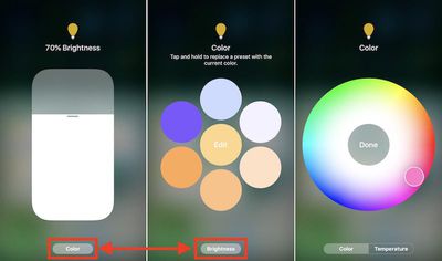 All'interno della sezione del Centro di controllo, le azioni di Home sono semplici: puoi toccare ciascun accessorio per accenderlo o spegnerlo, a seconda del suo stato attuale. Più utile è un gesto 3D Touch intelligente che fa apparire un interruttore di luminosità che consente il controllo percentuale incrementale di una lampadina collegata come Hue, ad esempio. Tocca "Colore" nella parte inferiore di questa schermata per tuffarti in una ruota dei colori dinamica per scegliere sei opzioni di colore preimpostate o modificarne una per passare a un selettore di colori arcobaleno per personalizzare veramente le tue luci all'interno del Centro di controllo.