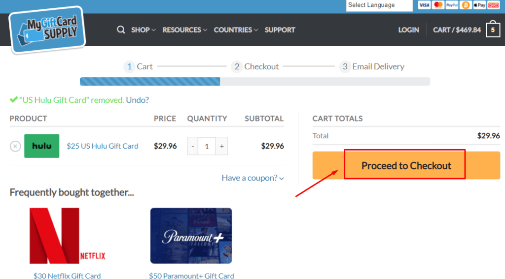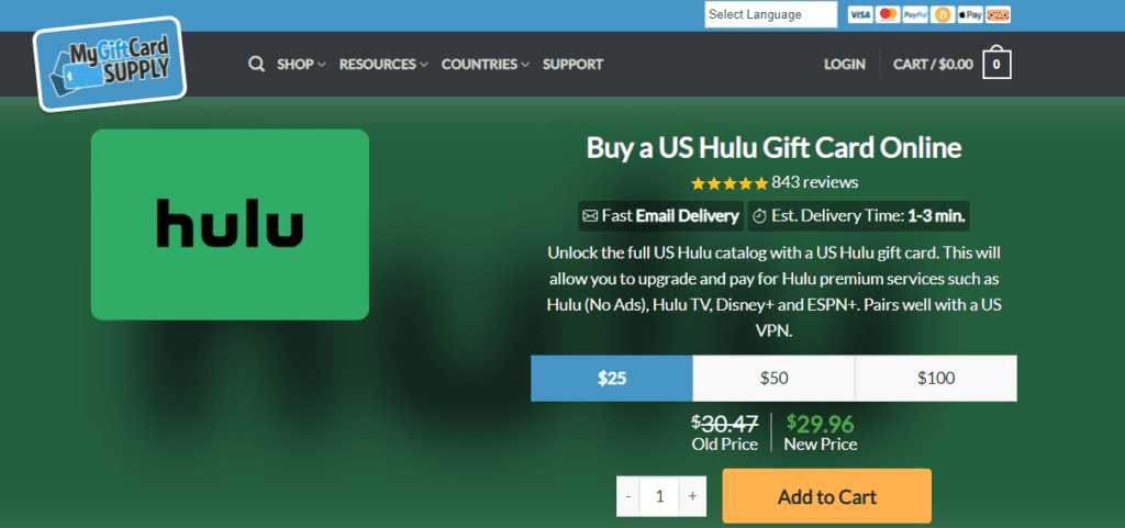 Ecco la guida passo passo su come acquistare una carta regalo Hulu su MyGiftCardSupply: