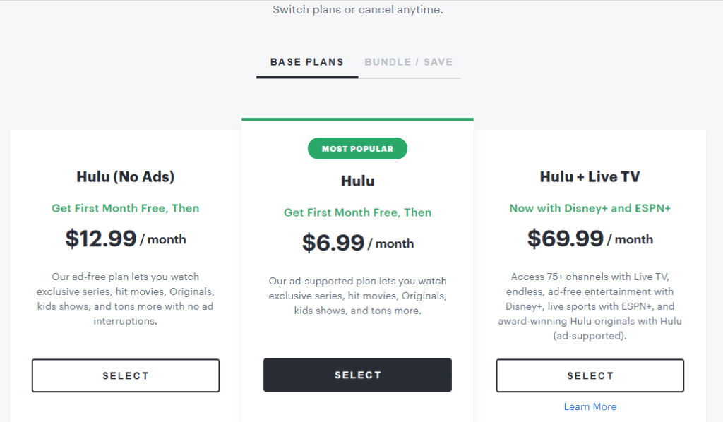 I pacchetti base (Hulu/Hulu – No Ads) includono l'intera libreria di streaming.