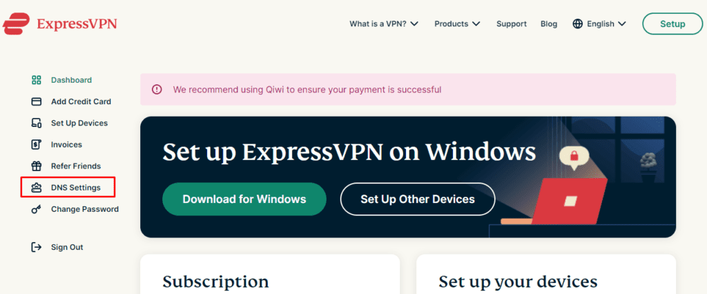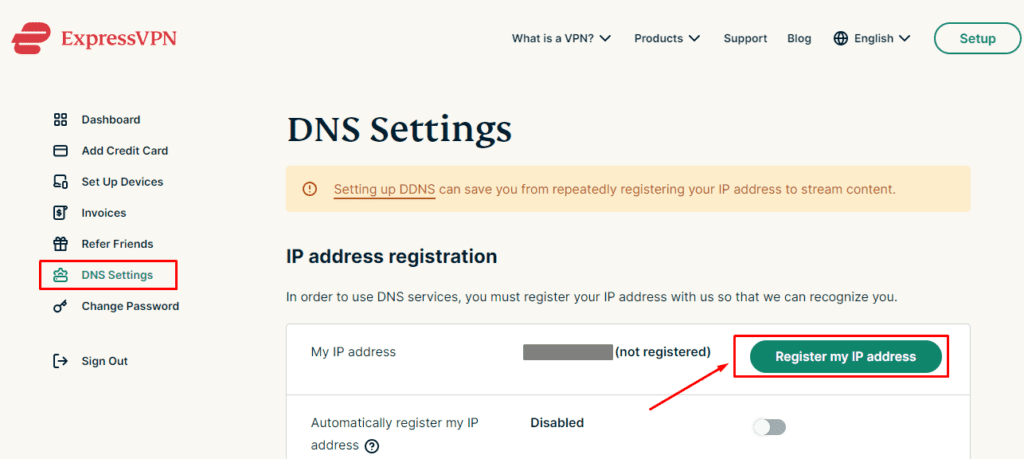 - Accedi al tuoConto ExpressVPNsul tuo browser e fai clic suImpostazioni DNSscheda.