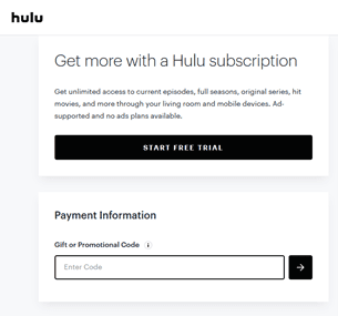 - Una volta ricevuto il codice della carta regalo Hulu, vai suhttps://www.hulu.com/start/e clicca su “PROVA FINO A UN MESE GRATIS.”