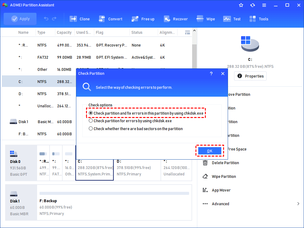 • Controlla la partizione e correggi gli errori in questa partizione utilizzando chkdsk.exe:Questa opzione identifica e corregge gli errori nella partizione.