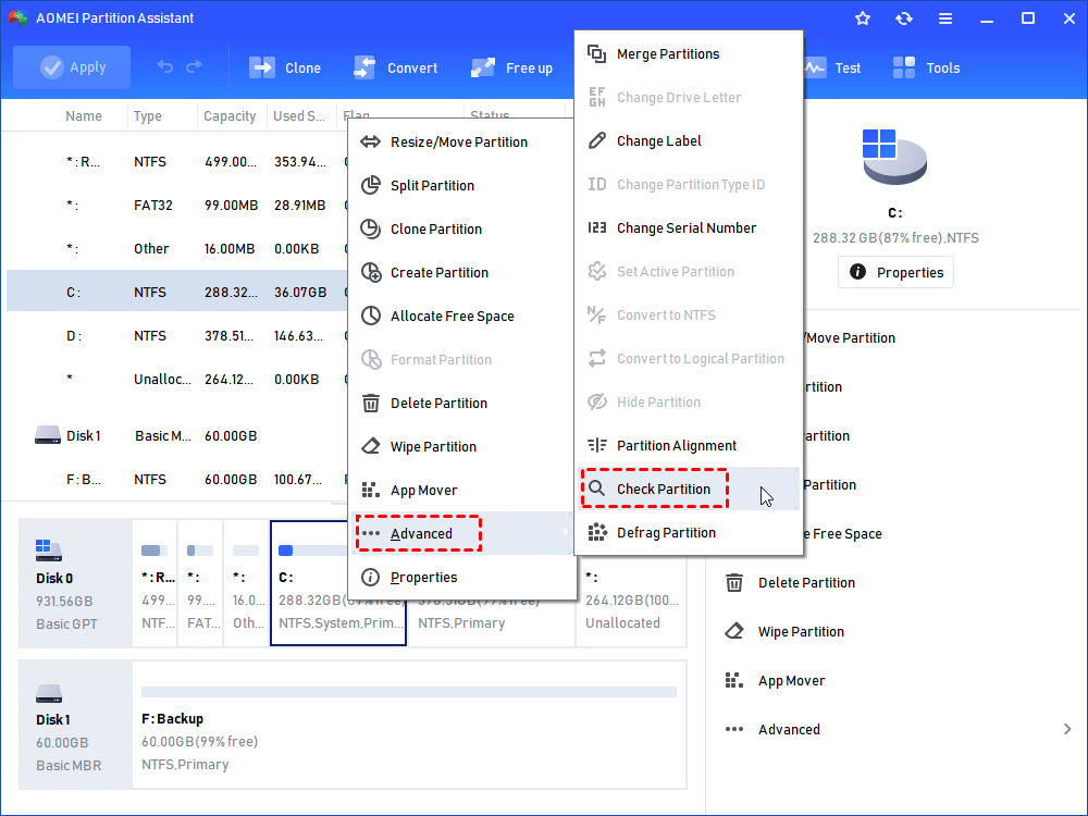 Passaggio 1. Fare clic con il pulsante destro del mouse sull'unità C e selezionare "Avanzate" seguito da "Controlla partizione".
