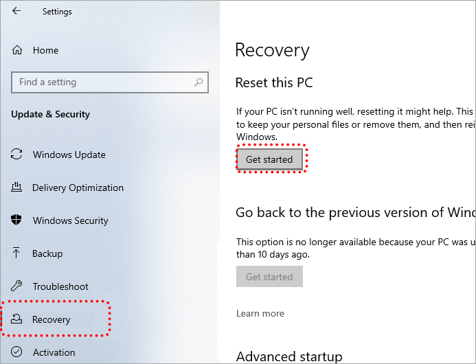 Passaggio 2: nella nuova finestra, fai clic su “Ripristino” e quindi seleziona “Inizia” in “Ripristina questo PC”.