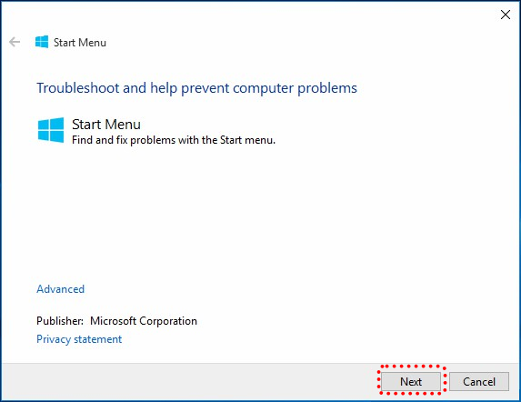 Passaggio 1: avviare lo strumento di risoluzione dei problemi del menu Start di Microsoft e fare clic su "Avanti".