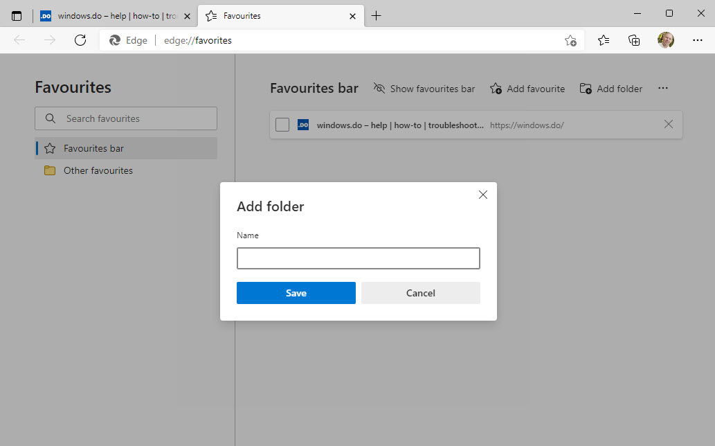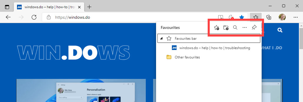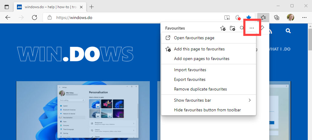 Se fai clic sull'icona dei tre punti per aprire il menu delle opzioni, vedrai opzioni aggiuntive tra cui la possibilità di importare i [tuoi] preferiti da un altro browser Web, cosa che potresti voler fare se stai passando a un altro browser da Google Chrome o Mozilla Firefox. Puoi gestire e organizzare i tuoi preferiti facendo clic su Apri pagina dei preferiti.