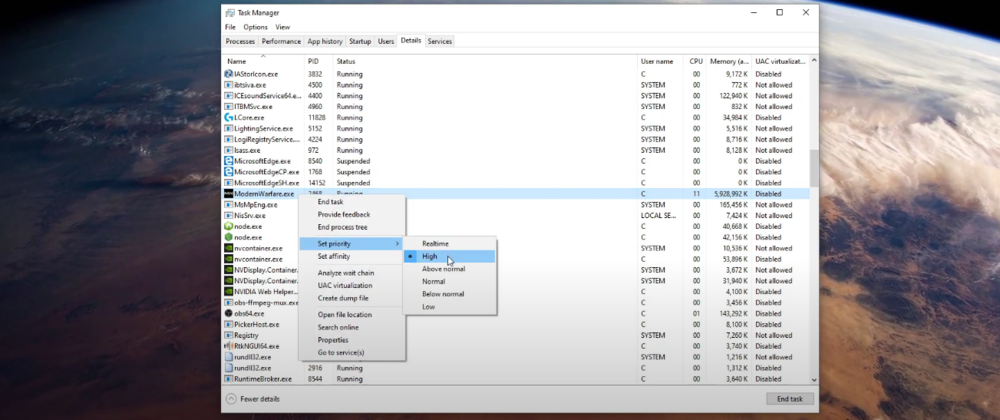 NelDettaglisezione, ilModernWarfare.exeprocesso dovrebbe essere evidenziato. Fare clic con il pulsante destro del mouse sul processo evidenziato e assegnargli la prioritàAltoa meno che non utilizzi una CPU dual-core. Se l'utilizzo della CPU è ancora al 100% dopo aver applicato questa modifica nel Task Manager, modifica la priorità del processo inSopra il normale. Ciò ti consentirà di vedere quali opzioni funzionano meglio per te.