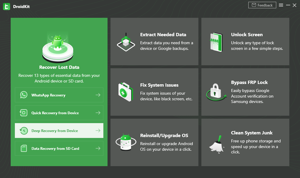 Passaggio 1. Scarica l'ultima versione di DroidKit sul tuo computer e connettiti al tuo telefono Android. Scegli Recupero profondo dal dispositivo.