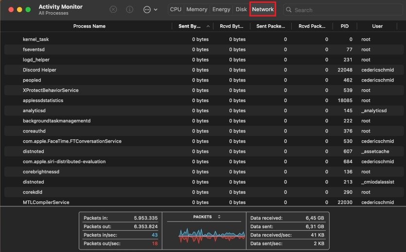 Infine, dovresti ridurre il numero di applicazioni in esecuzione sul tuo Mac utilizzando la connessione di rete. Apri il tuoMonitoraggio dell'attività. Vedrai un elenco di processi che utilizzano la tua connessione di rete nel fileRetesezione. Potrebbe trattarsi di un'applicazione, un browser o un servizio Mac OS diverso. Puoi quindi procedere e uscire da quelle app prima di provare nuovamente a partecipare a un'esperienza Roblox.