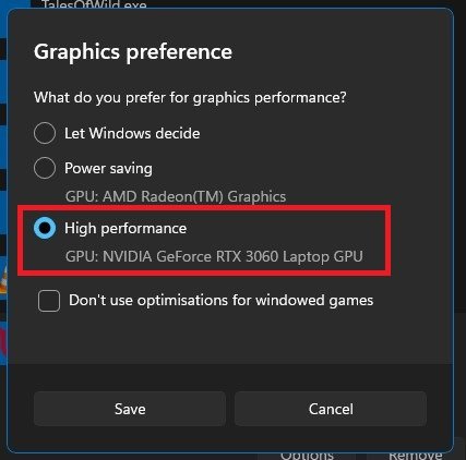 V Preferenza grafica in aumento > Prestazioni elevate
