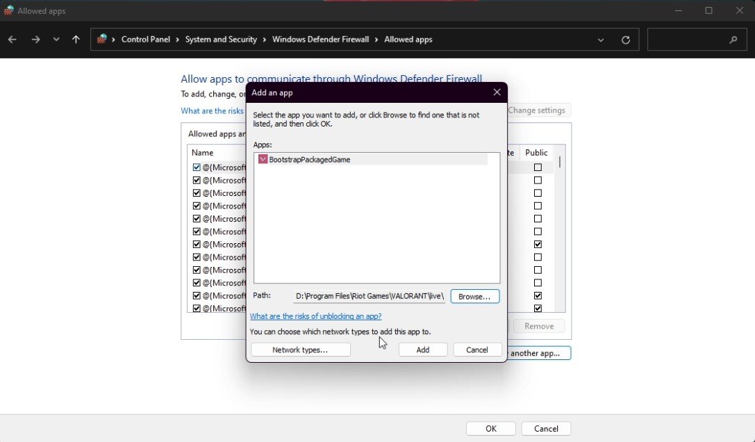 SelezionareModificare le impostazioni, poiConsenti un'altra app. SelezionareSfogliae il tuo Esplora file si aprirà. Passare all'unità su cui hai salvato il gioco,File di programma>Giochi di rivolta>VALORIZZARE>viveree seleziona l'applicazione Valorant e selezionaAprire. Ciò ti consentirà di escludere che l'applicazione venga bloccata dal firewall e, per alcuni utenti, preverrà il problema.