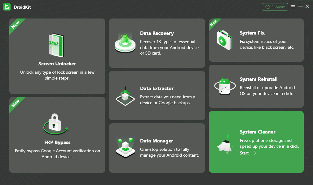Passaggio 1. Inoltre, avvia DroidKit sul tuo computer e vai suPulitore del sistema.